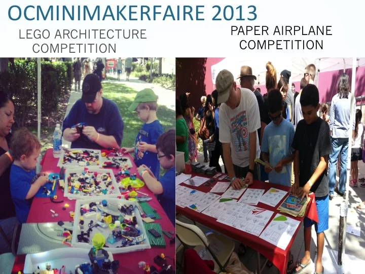 This year at OCMiniMakerFaire the OCHackerz team volunteered to conduct a 2 part activity. One part allowed kids and adults to build a paper airplane from one of the easy-difficult prototypes I'd supplied to fly the furthest distance. On the other side kids were faced with the challenge of of building a lego prototype of a flying car inspired by our friends at Carravella Aerospace.